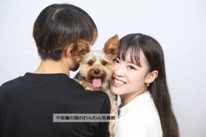 | 人物と一緒撮影 | お選びいただいた背景の前でわんちゃんと一緒に撮影。 人物は上半身(顔アップ)の撮影となります。 オプション料金 撮影料 人物一名1,100円 8歳以下の子供1名2,200円 |